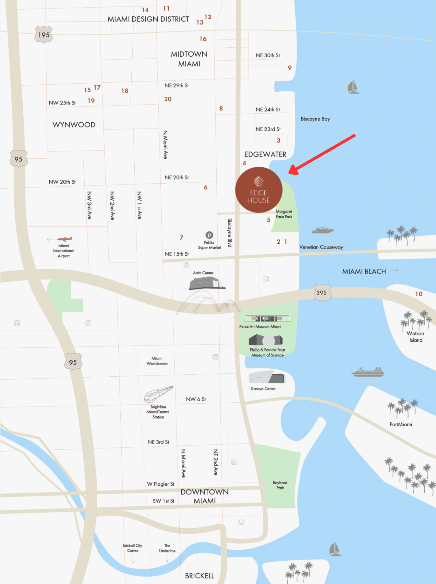 Ubicado en el corazón vibrante de Edgewater en Miami, Edge House goza de una ubicación central junto a las orillas de la Bahía de Biscayne, enclavado entre Downtown Miami y el Design District, con una cercanía inmejorable a opciones de entretenimiento, alta gastronomía, tiendas exclusivas, parques y experiencias culturales.
